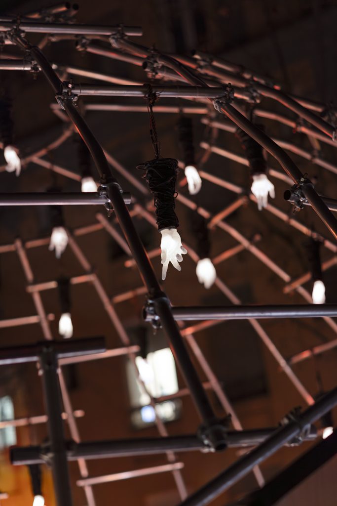 Su questo corpo si eleva una cupola formata da barre di alluminio unite con morsetti da ponteggio. La sua geometria rimanda alle strutture precedenti allo sviluppo delle cupole rinascimentali. All’interno di questa cupola è integrata inoltre un’installazione di illuminazione LED ed elementi scultorei sospesi: mani con prolungamenti di braccia realizzate a partire da diversi tipi di plastica riciclata.