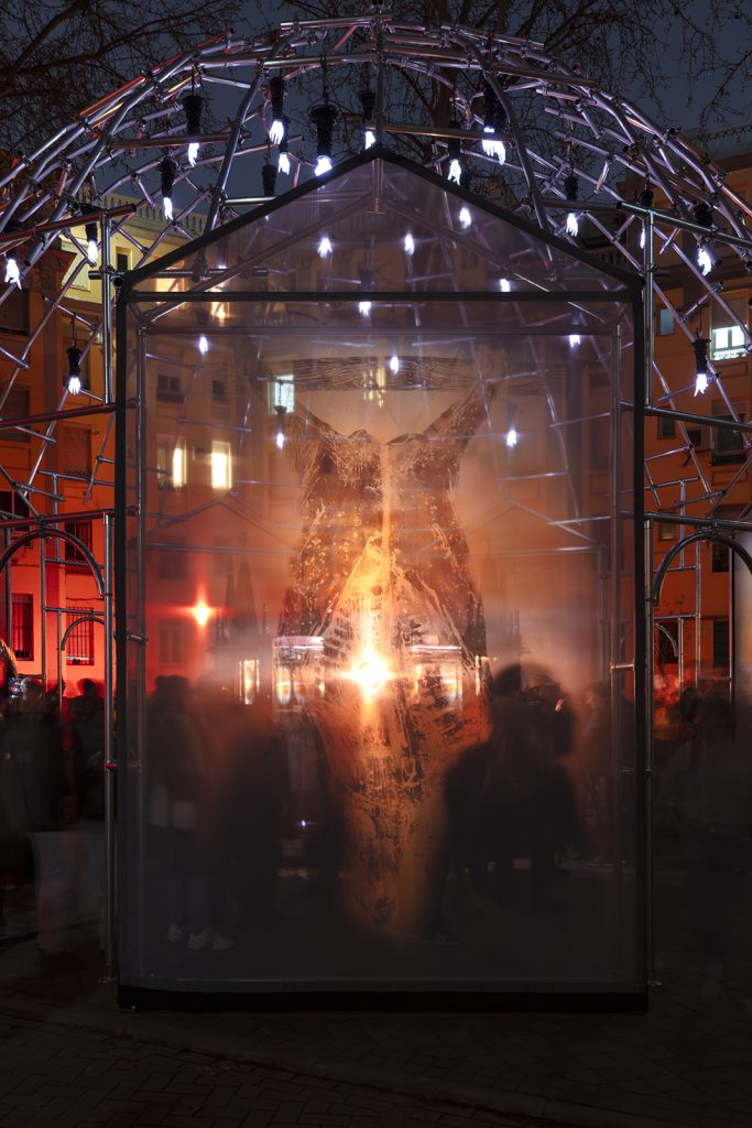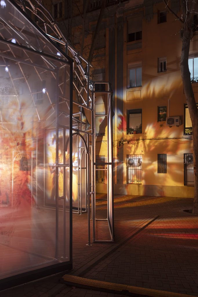 “Redentora” è un’installazione audiovisiva articolata attorno a uno zootropio integrato in una struttura metallica a forma di tempietto, con sette accessi e una cupola. È stata realizzata per il Festival LuzMadrid durante i giorni 12, 13 e 14 marzo 2026 nella Glorieta de San Víctor, Madrid.