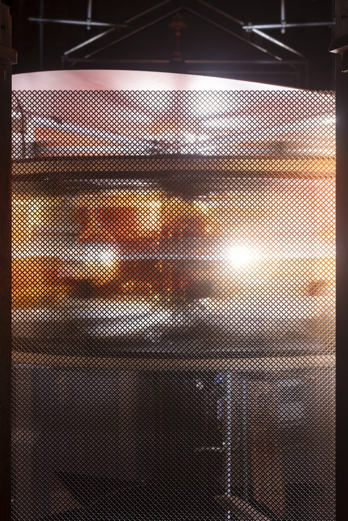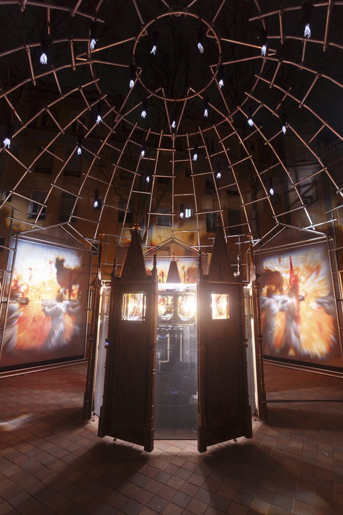 Ventuno vetri dipinti, disposti sul perimetro di un tamburo, ruotano sincronizzati con il lampeggio di sette faretti. Questo meccanismo proietta su sette garze olografiche un’animazione visibile sia dall’interno che dall’esterno dell’installazione.