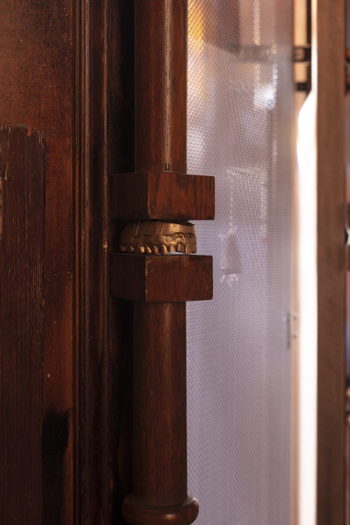 Circondando la macchina, sette confessionali “contemporanei” configurano il perimetro esterno. Si tratta di assemblaggi di pezzi di legno che evocano strutture di origine ecclesiastica. Questi pezzi sono collegati tra loro mediante lamiere metalliche microforate, chiudendo l’insieme.